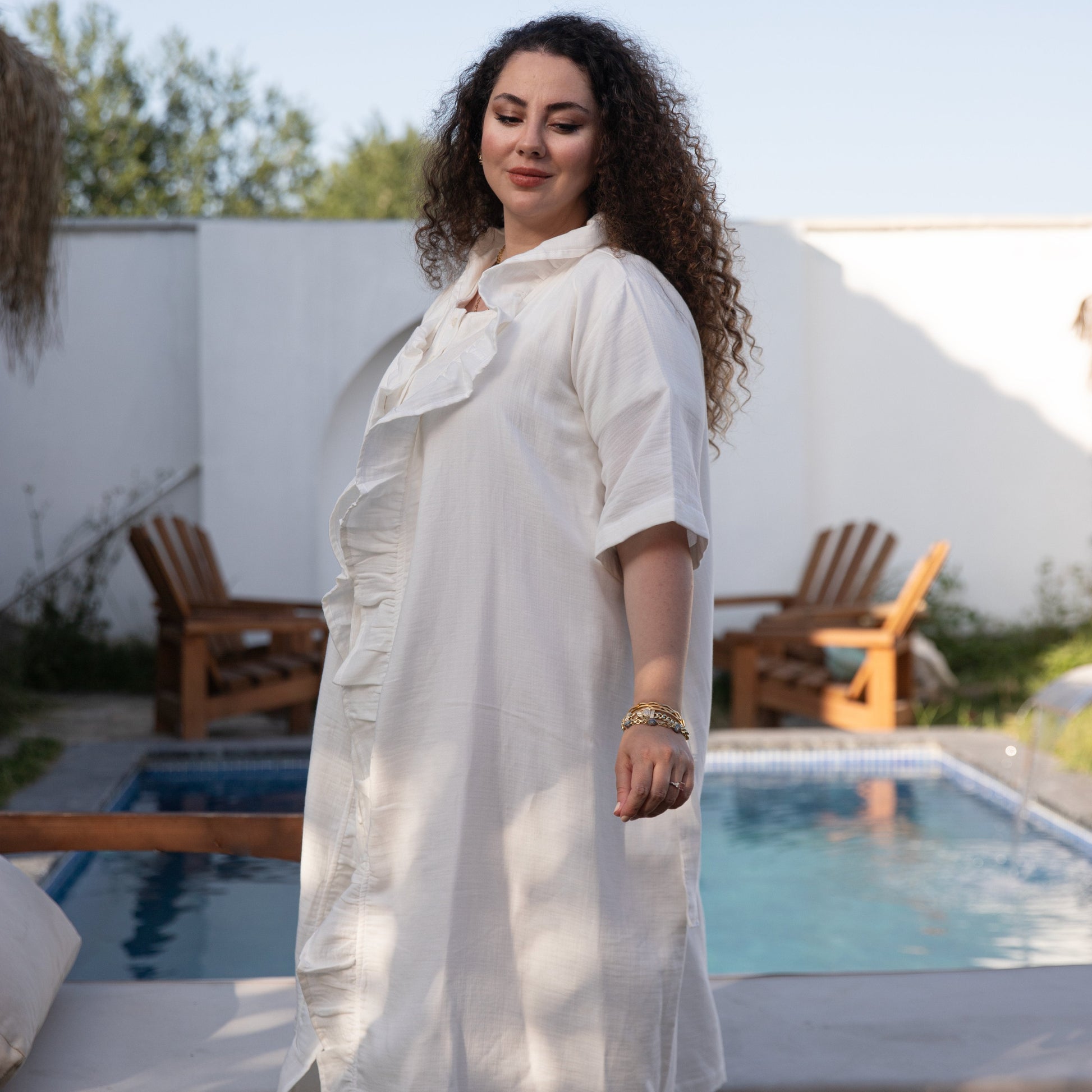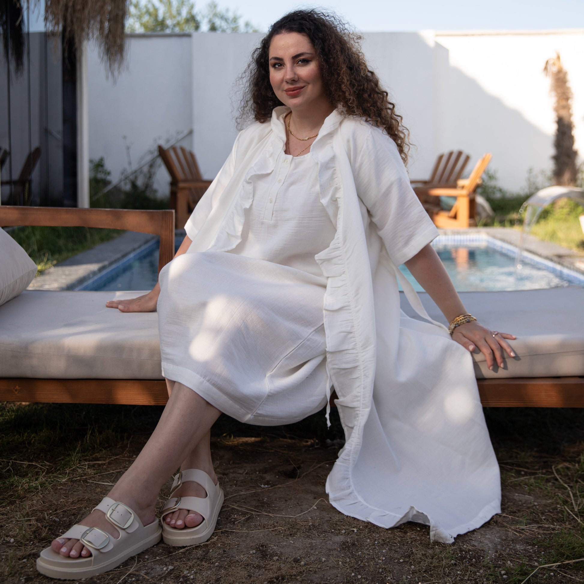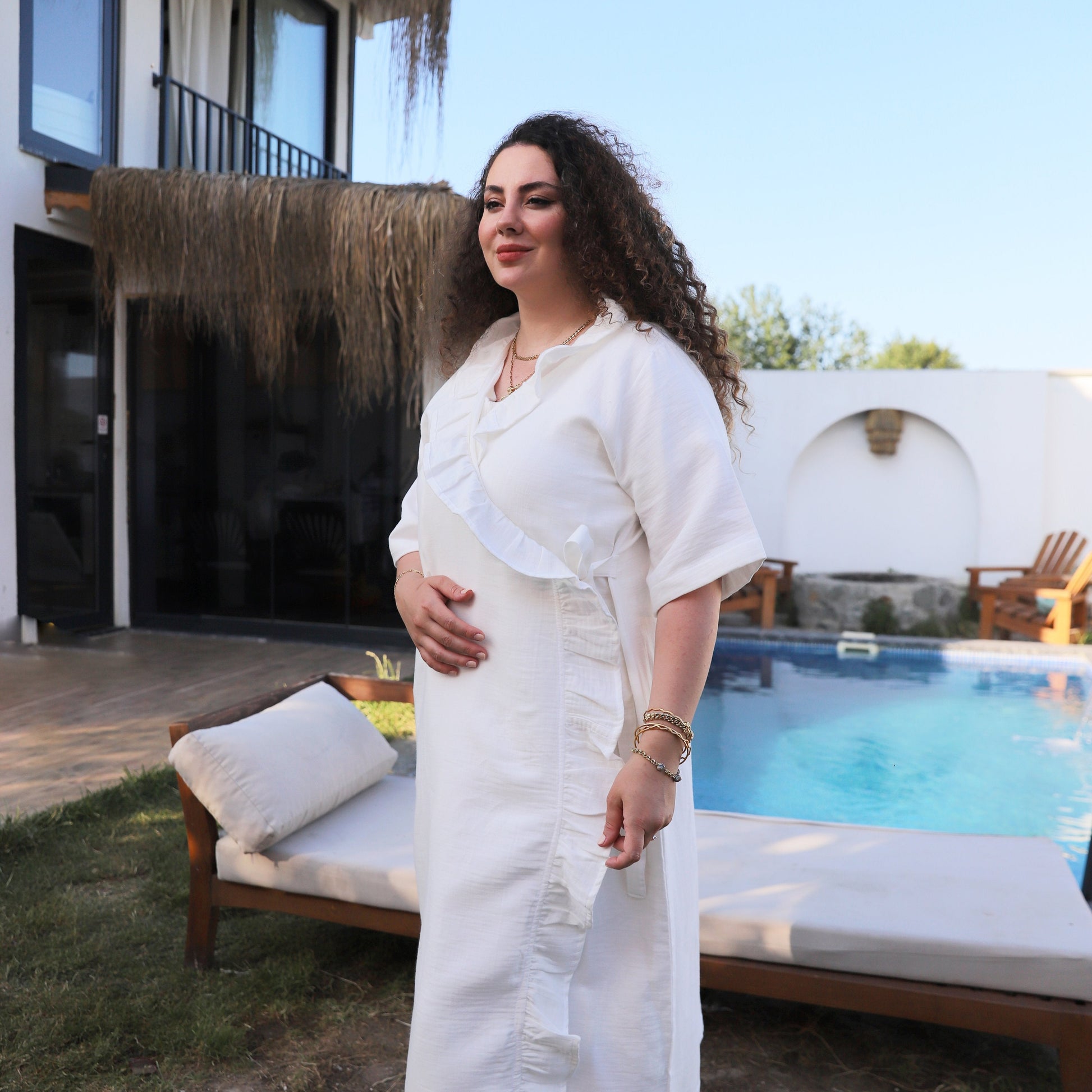 Nest Serisi ekru müslin sabahlık takımı, doğum sonrası konforu ve doğal şıklığı bir arada sunar. Yumuşak ve nefes alabilen yapısı sayesinde hassas ciltler için idealdir. Takımda yer alan kısa kollu sabahlık ve sade kesimli gecelik, emzirme döneminde pratiklik sağlarken zarif görünümden ödün vermez. Rahat kalıbı ve sade detaylarıyla Nest Serisi, annenin lohusa sürecini huzurlu ve şık bir deneyime dönüştürür.