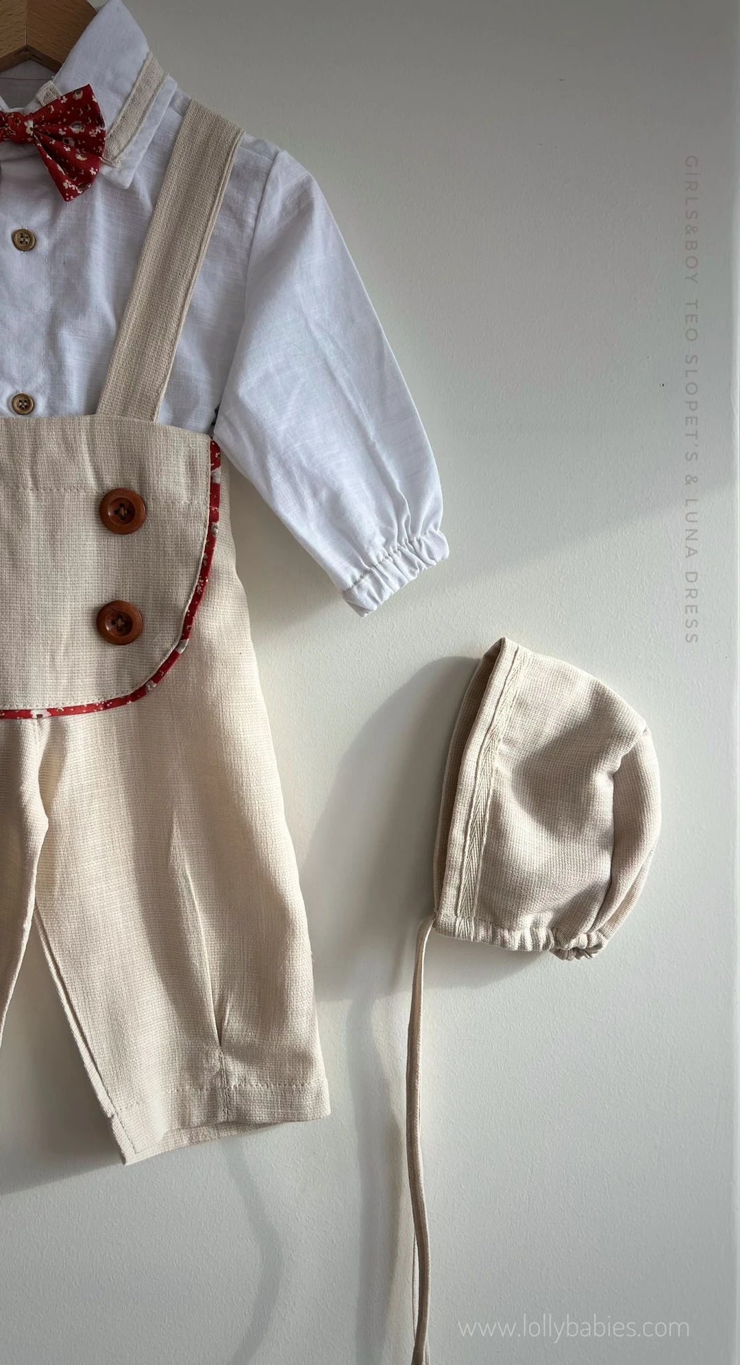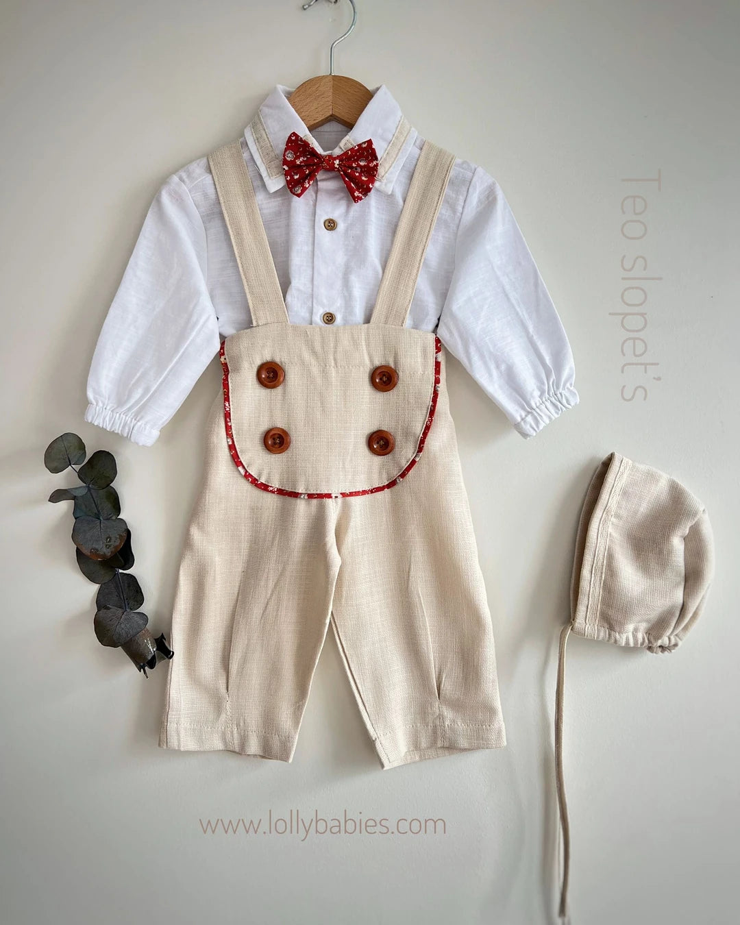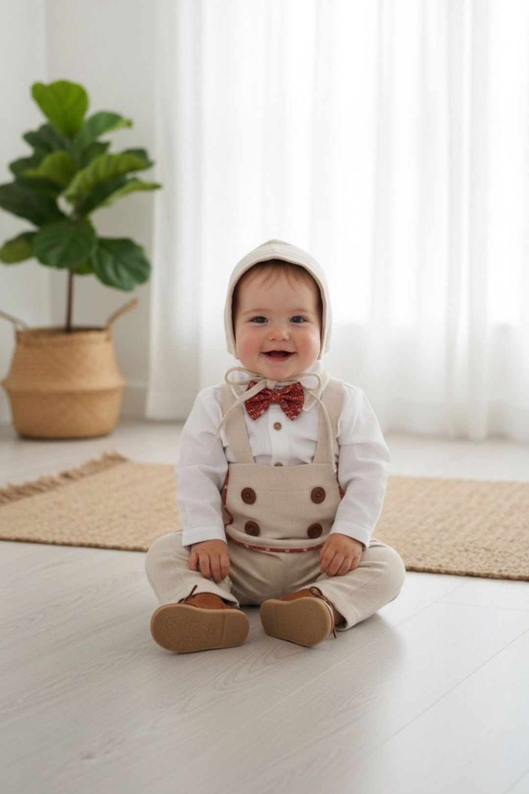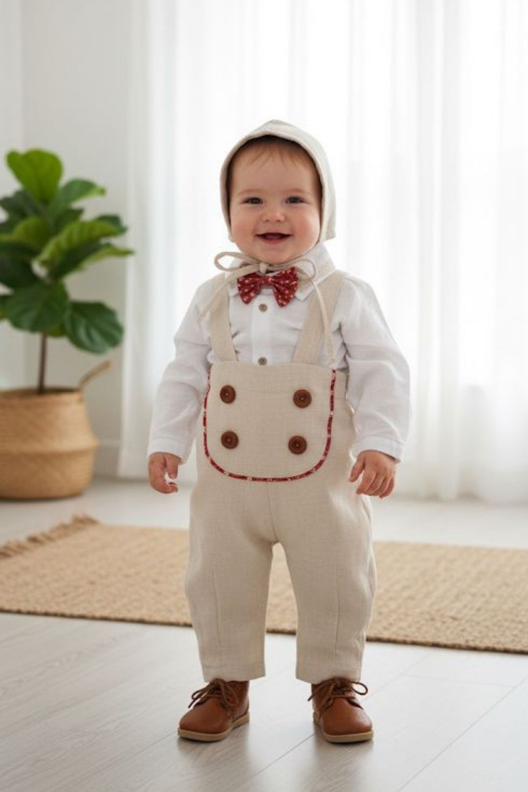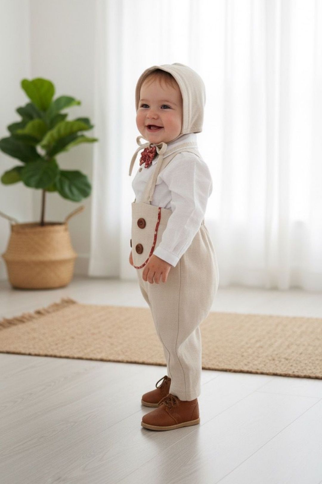 Keten kumaşın zarif dokusuyla tasarlanan bu erkek bebek salopet takımı, özel günler ve günlük kullanım için hem konforlu hem de şık bir seçenektir. Yaz aylarında serin tutan doğal yapısıyla bebeğinizin hassas cildiyle uyumludur. Düğmeli gömlek, papyon ve şapka detaylarıyla klasik bir görünüm sunar.