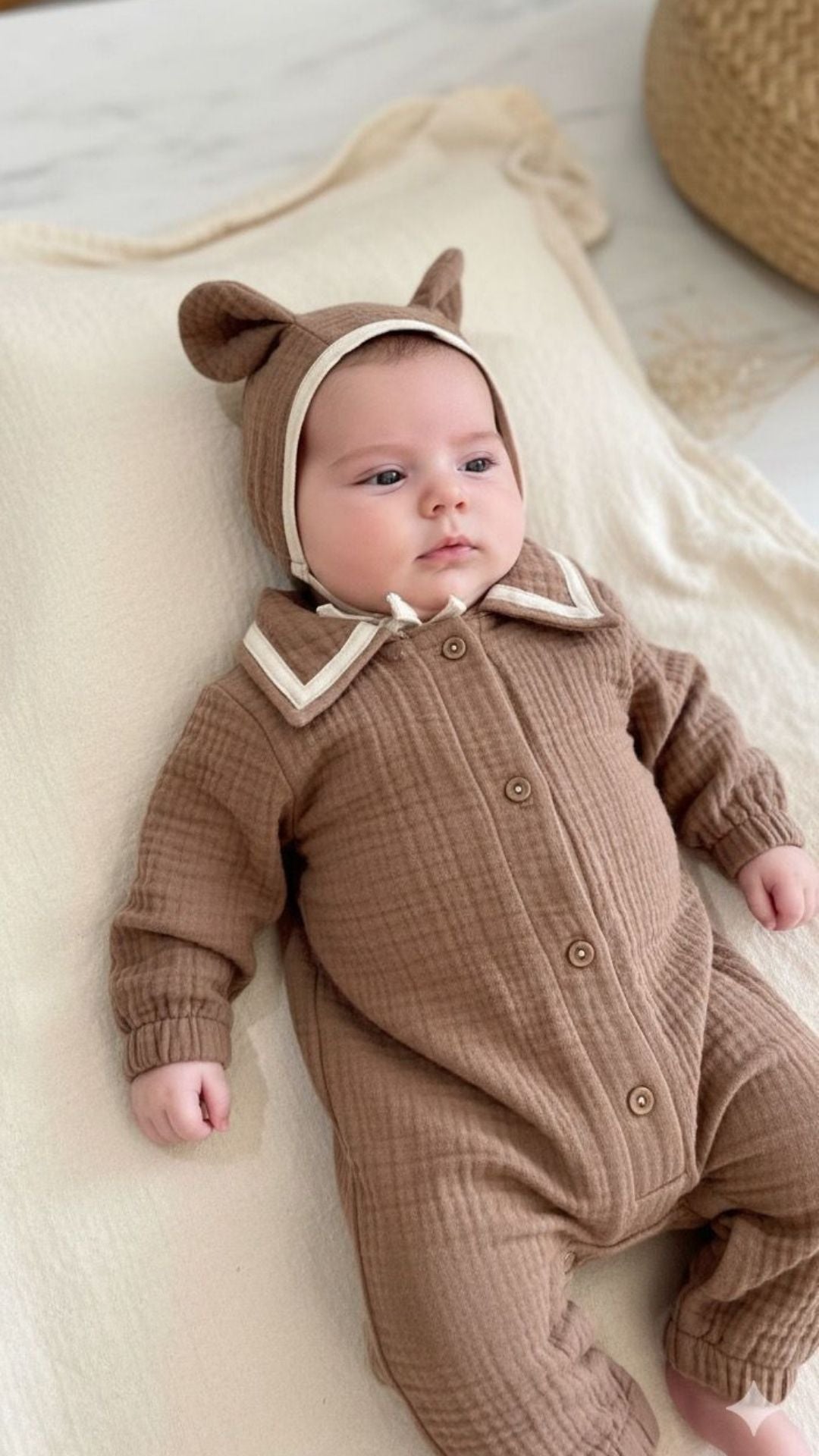 Yenidoğan bebekler için özel olarak tasarlanan bu erkek bebek tulumu, %100 pamuklu müslin kumaşı sayesinde yumuşacık bir dokuya sahiptir. Nefes alabilen yapısı ile bebeğinizin hassas cildini korur, dört mevsim kullanıma uygundur. Pratik düğmeli yapısı ile kolayca giydirilip çıkarılabilir. Günlük kullanımda, hastane çıkışlarında ve özel günlerde konforlu ve şık bir tercih sunar.