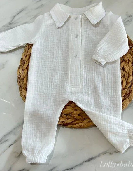 Yenidoğan bebekler için özel olarak tasarlanan bu beyaz erkek bebek tulumu, %100 pamuklu müslin kumaşı sayesinde yumuşacık bir dokuya sahiptir. Nefes alabilen yapısı ile bebeğinizin hassas cildini korur, dört mevsim kullanıma uygundur. Pratik çıtçıtlı yapısı ile kolayca giydirilip çıkarılabilir. Günlük kullanımda, hastane çıkışlarında ve özel günlerde konforlu ve şık bir tercih sunar.