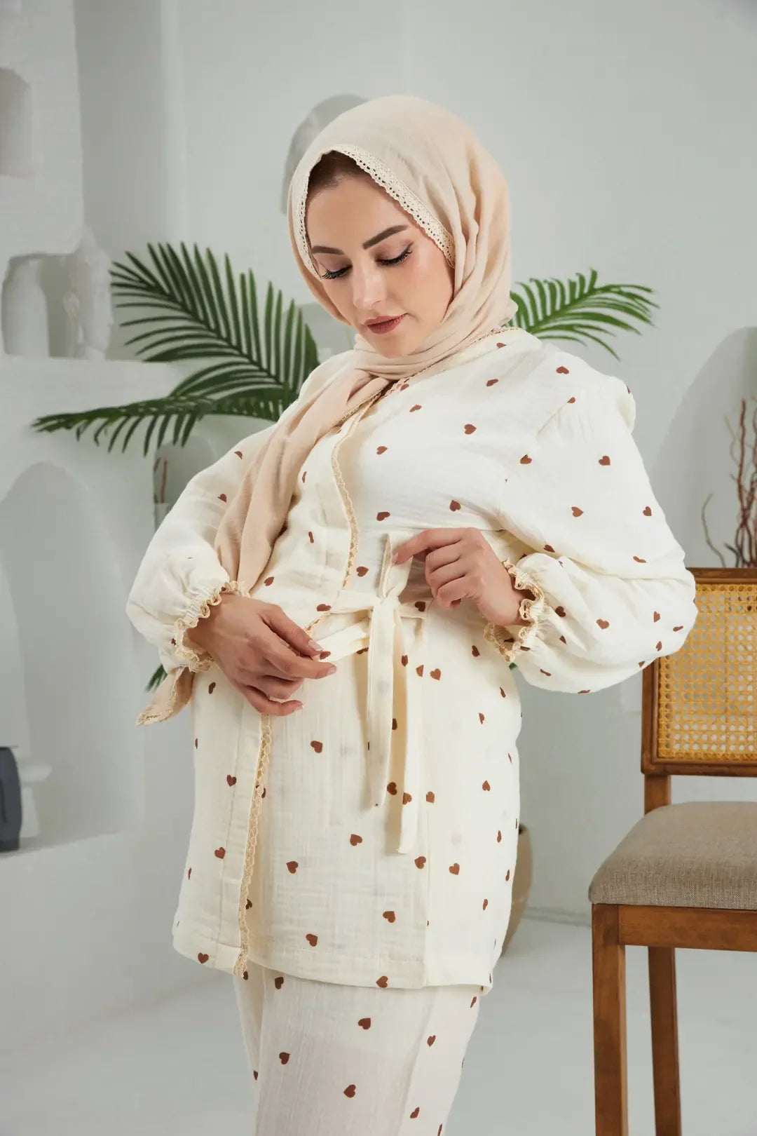Love Serisi lohusa takımı %100 pamuk kumaştan üretilmiştir. Cilde nefes aldıran, yumuşak ve terletmeyen bir yapıya sahiptir.