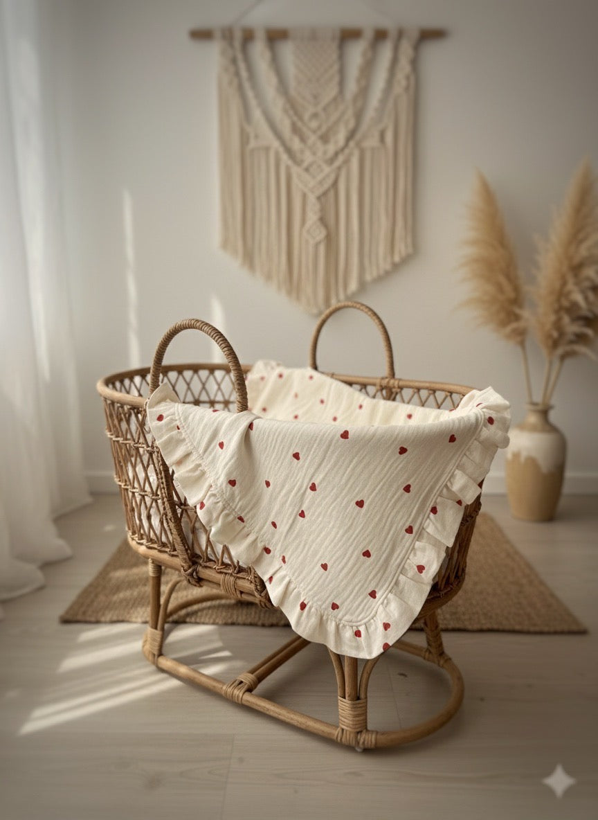 Kalp desenli bu özel müslin battaniye, yenidoğan ve bebeklerin hassas cildi için ideal bir örtüdür. %100 pamuklu, dört katlı yapısıyla yumuşacık bir doku sunar. Nefes alabilen kumaşı sayesinde terletmez; ister kundak örtüsü ister oyun matı ya da hafif bir yaz örtüsü olarak kullanılabilir. Hem şık hem de fonksiyonel bu bebek battaniyesi, bebek bakımının vazgeçilmez parçalarındandır.