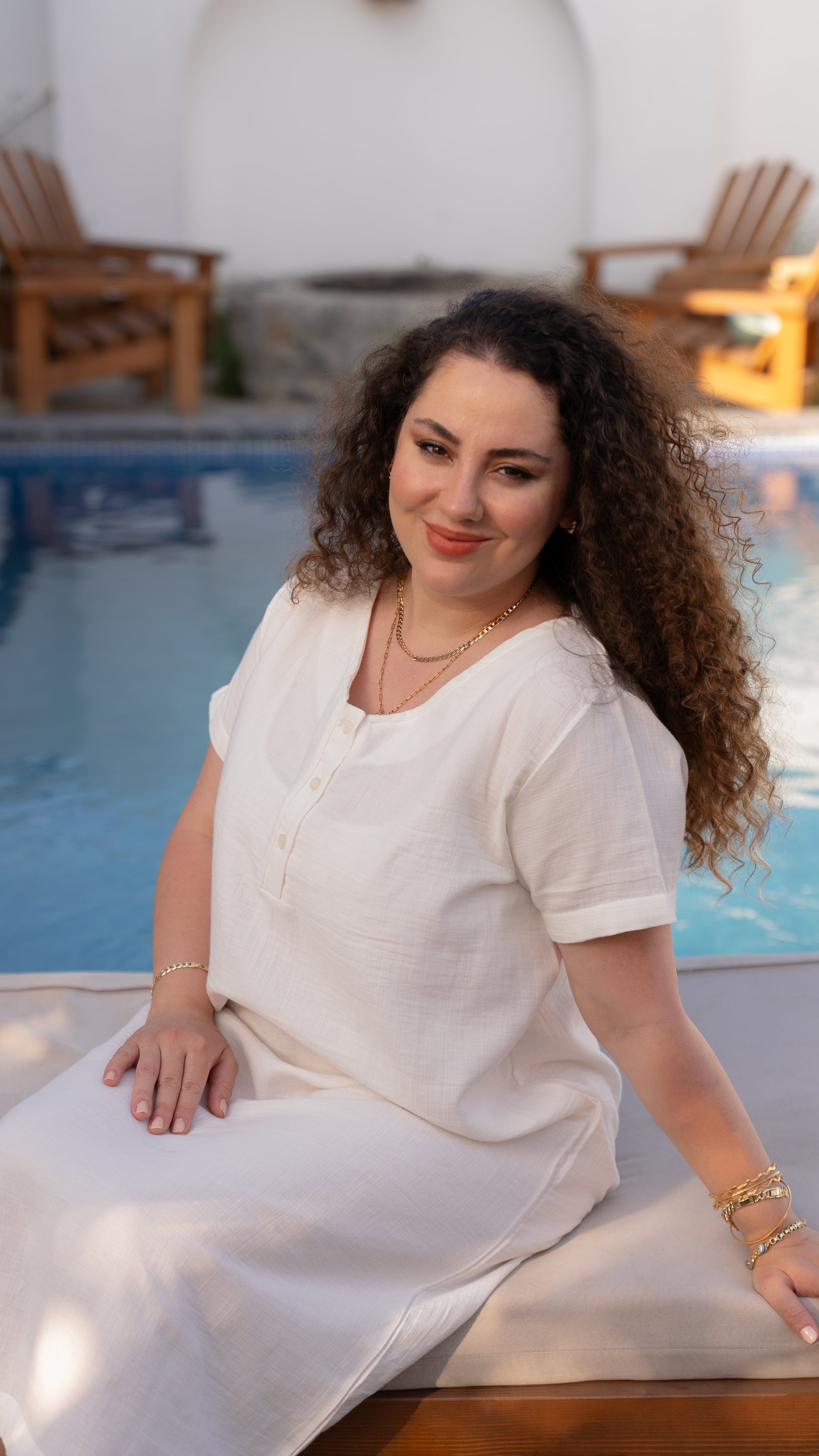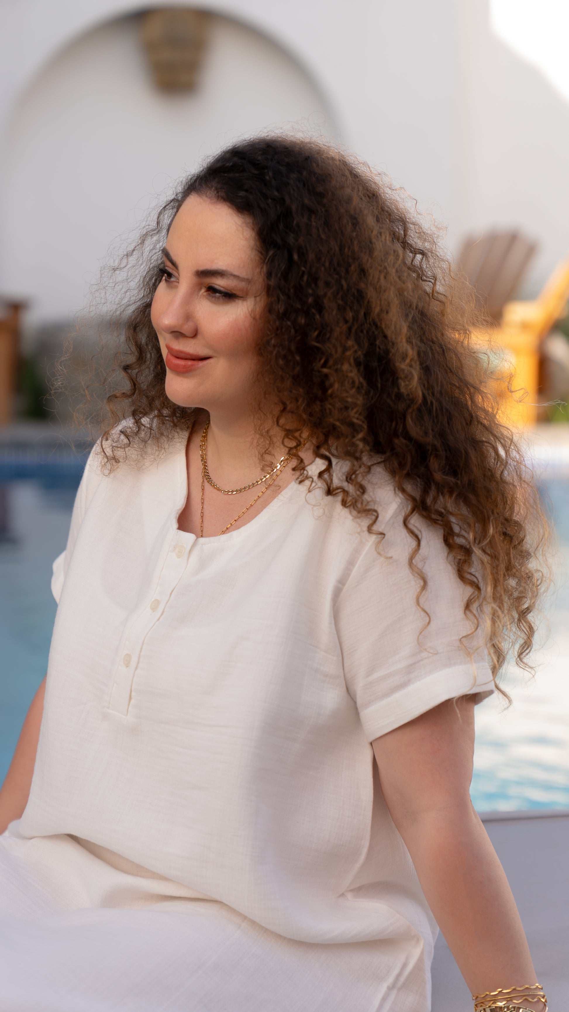 Yalınlığı ve doğallığı yaşam alanınıza taşıyan bu beyaz müslin elbise, %100 organik pamuk kumaşıyla cildinize dost bir dokunuş sunar. Nefes alan yapısı sayesinde sıcak günlerde ferah bir kullanım sağlar, terletmez, tahriş etmez. Angel Serisi’nin zarif çizgileriyle tasarlanan bu kısa kollu model, hem ev giyimi hem de konforlu günlük şıklık arayanlar için ideal.