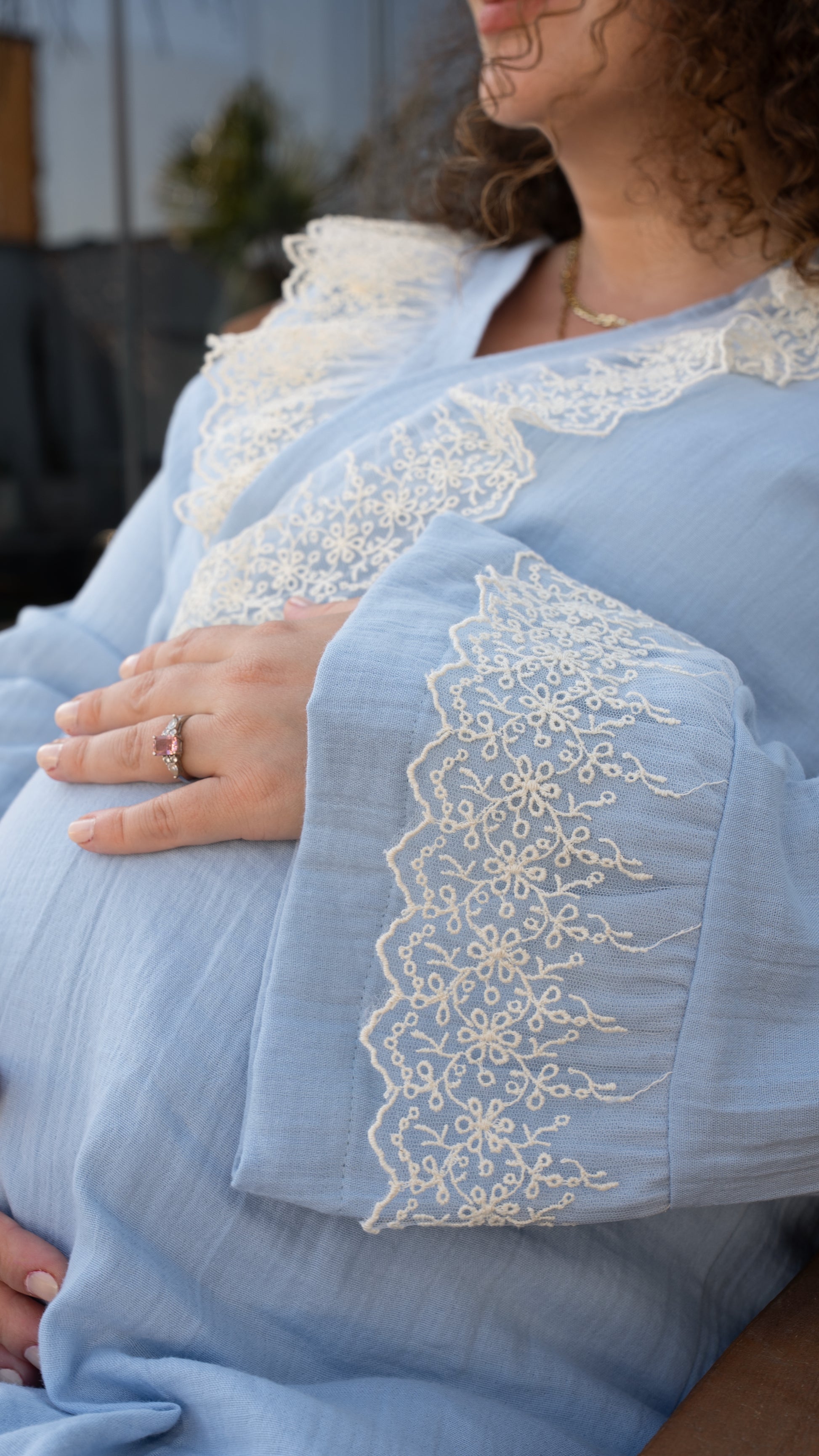 Zarif ve konforlu bir lohusa takımı arıyorsanız, bu mavi renkli pijama seti tam size göre.