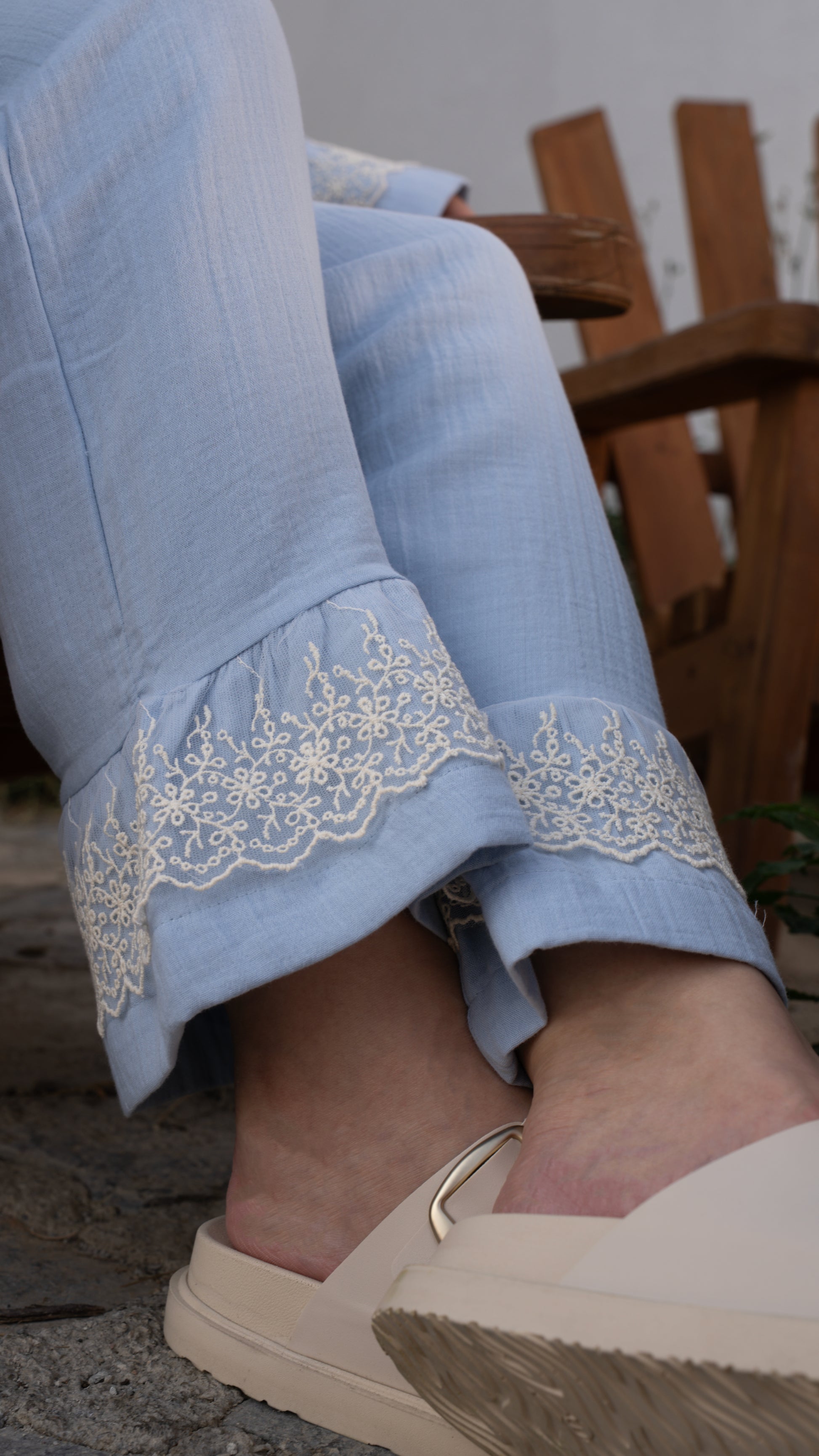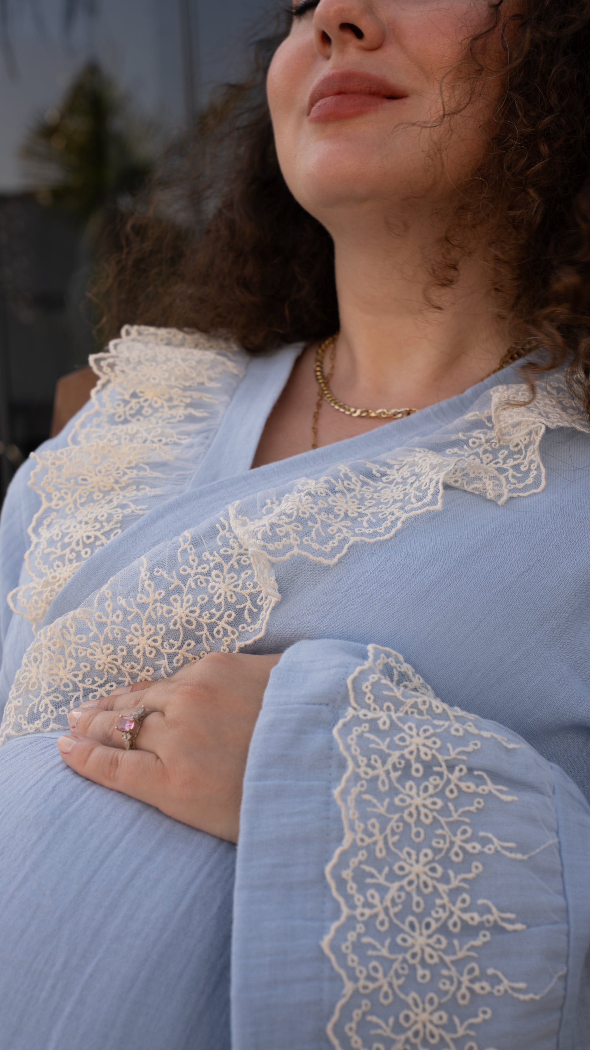 Kruvaze kesimiyle rahat giyilebilirlik sunan üst parça, ince zarif dantel detayıyla göz alıcı bir şıklık kazandırır. Yumuşak dokulu pijama altı ise gün boyu konfor sağlar. Lohusalık döneminde şıklığından ödün vermek istemeyen anneler için özel olarak tasarlanmıştır.