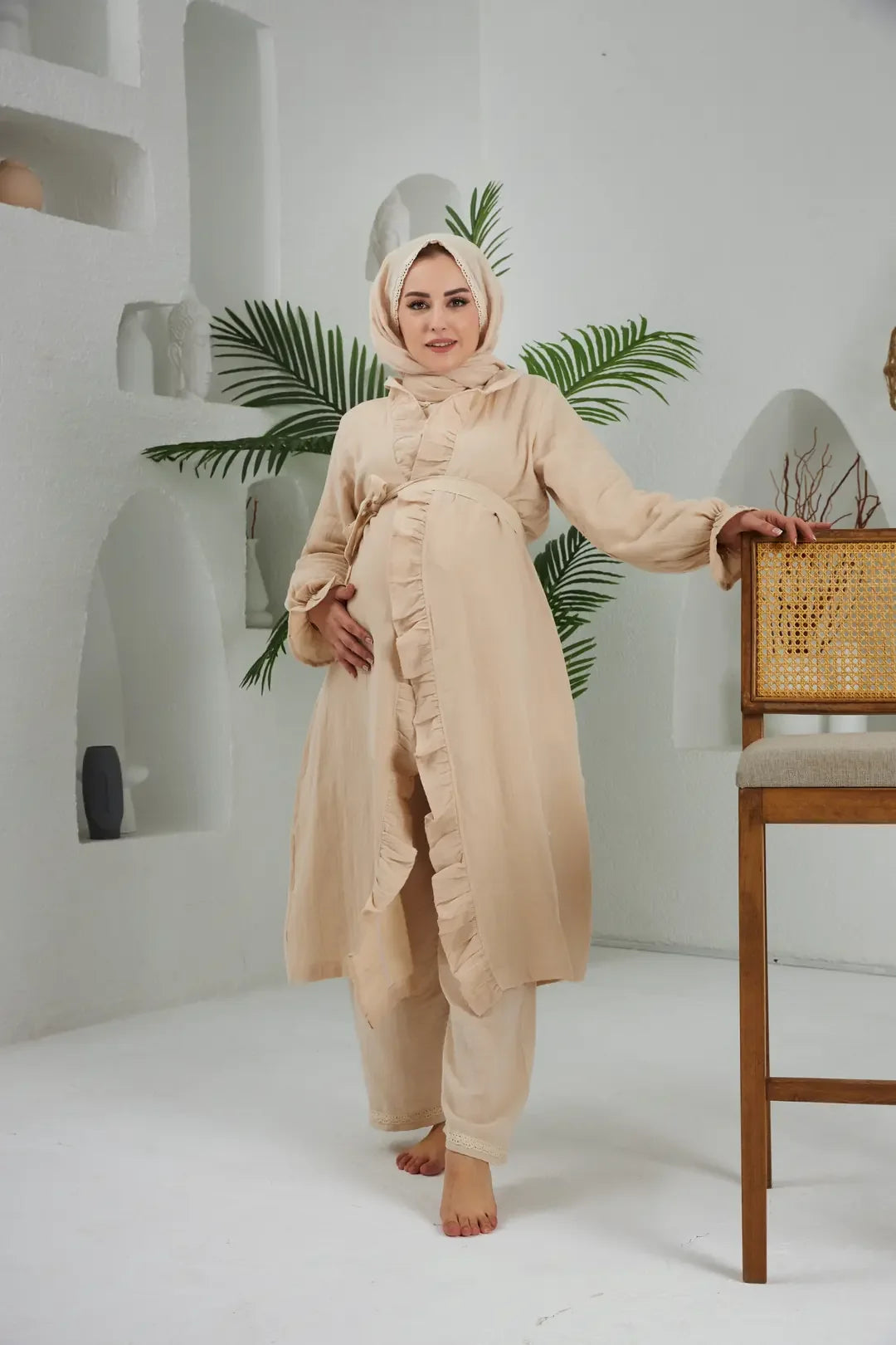 Zarif tasarımı, sade bej rengi ve geniş beden aralığı ile hem şık hem işlevsel bir kullanım sunar. Angel Serisi sabahlık, doğal yaşamı tercih eden kadınların gardırobuna zamansız bir parça olarak eklenir.